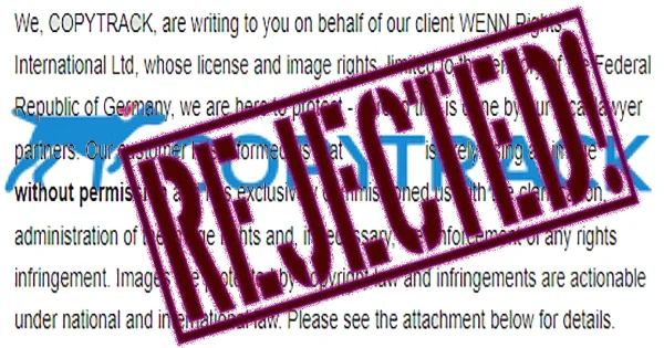 In my next post, I plan to discuss how that response does not make sense. But they certainly have no issues with me contacting Wenn regarding Copytrack’s enforcement, which I did. I feel this email opens the floodgates to contacting their clients directly. Contacting their client as you respond to Copytrack with the solutions I provide below may allow you to close the case faster or negotiate for better terms. If you do, please be civil and not make threats.