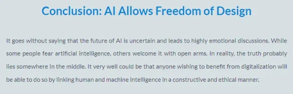 The closing header says, “Conclusion: AI Allows Freedom of Design”. I wonder what part of art thinks creators need free from when they think a frame and some commands is enough work. OR is it freedom of design for those who do nothing to invest in the skill?